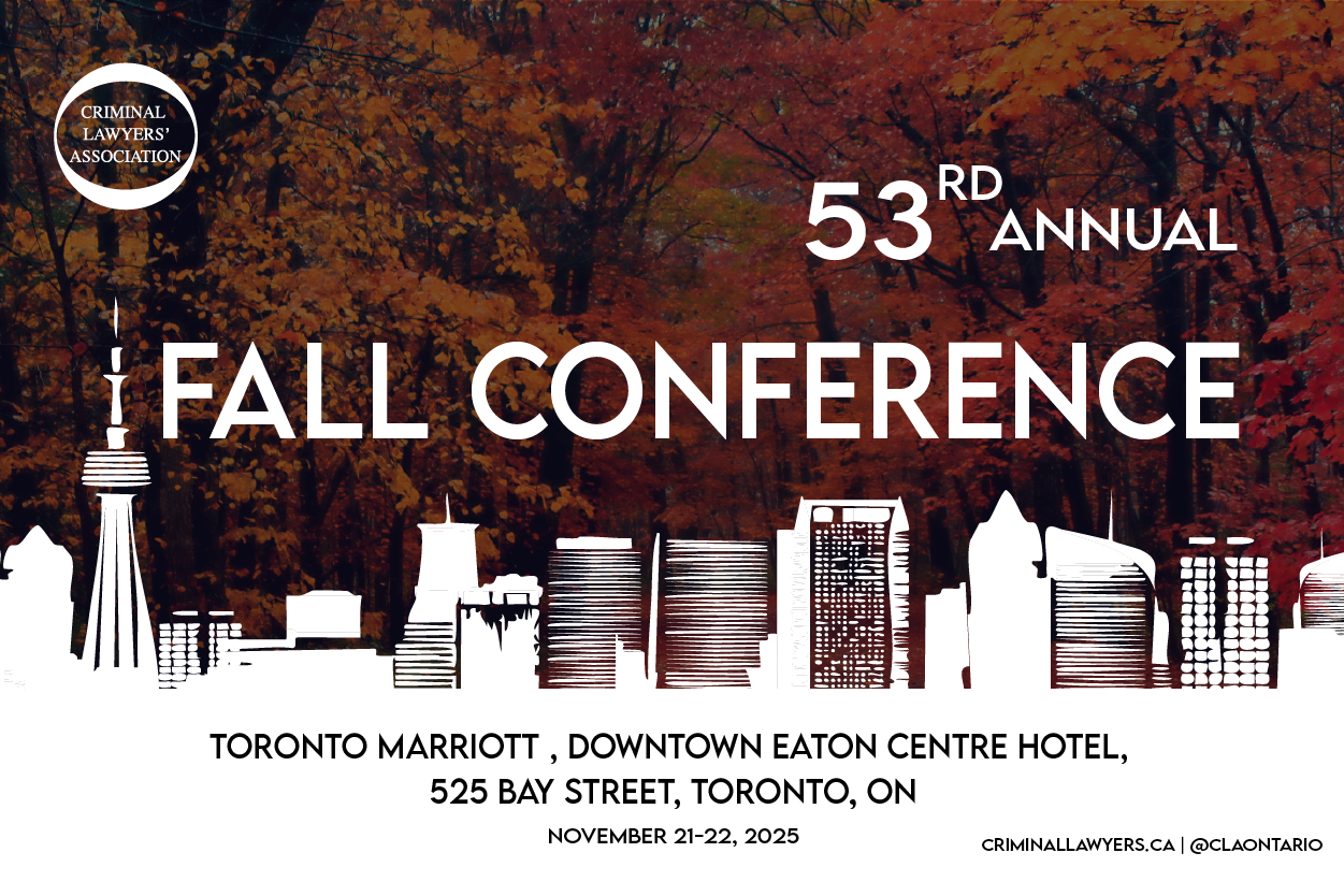 54th Annual Fall Conference Program Type: CLA Fall Conferences Date: November 20-21, 2026 The 54th annual Criminal Lawyers’ Association Fall Conference is scheduled for November 20-21, 2026. Toronto Marriott Downtown Eaton Centre Hotel, 525 Bay Street, Toronto The Annual Criminal Lawyers’ Association Fall Conference is Canada’s largest criminal law conference attracting more than 700 defence lawyers, judiciary, educators, reporters and other prominent guests from across Canada. Note, the […] |